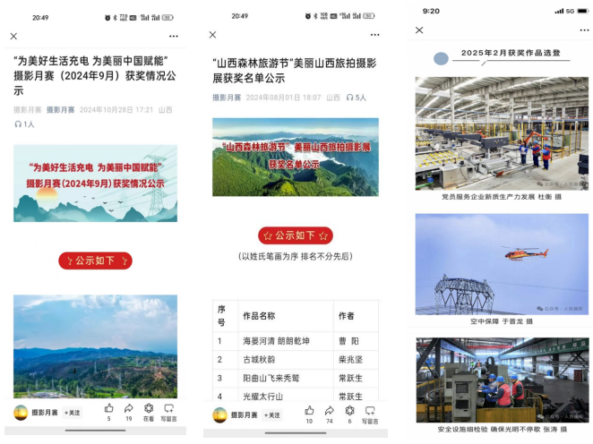 “電約拍”2.0項目實(shí)施以來,重點(diǎn)培養(yǎng)團(tuán)隊成員17名,輻射帶動80余名基層通訊員實(shí)戰(zhàn)能力提升,9名同志被山西攝影家協(xié)會吸收為會員。2024年,在人民日報、新華社、山西電視臺、山西日報、國家電網(wǎng)各類媒體平臺發(fā)表圖片594幅、視頻報道335條,分別同比增長430%、177%,宣傳績效得到有效提升,為企業(yè)高質(zhì)量發(fā)展?fàn)I造了良好的內(nèi)外部輿論環(huán)境?!半娂s拍”團(tuán)隊創(chuàng)作的《稻田喜事》《表里山河處處皆新色》等視頻作品獲得全國品牌故事大賽一等獎;短視頻“凌空一擊”全網(wǎng)點(diǎn)擊量超2億,評論、轉(zhuǎn)發(fā)次數(shù)過萬。人民攝影報先后以三個整版對“光影筑夢 點(diǎn)亮河?xùn)|”“與光同行 一路奮晉”“光影中的晉電力量”主題進(jìn)行圖文報道。