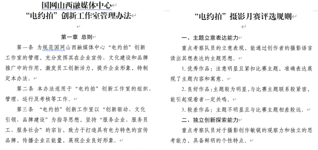 制定《“電約拍”創(chuàng)新工作室管理辦法》《2024年“師帶徒 青藍(lán)計劃”新聞采訪實(shí)訓(xùn)方案》《圖片資源管理系統(tǒng)管理辦法》《“電約拍”團(tuán)隊積分獎勵辦法》《爭創(chuàng)“七個最”宣傳成果工作方案》《“為美好生活充電 為美麗中國賦能”攝影月賽評選規(guī)則》《“電約拍”采風(fēng)承諾書》等相關(guān)制度,通過完善的管理機(jī)制和制度,推進(jìn)了項目規(guī)范化運(yùn)營、標(biāo)準(zhǔn)化管理。加強(qiáng)團(tuán)隊文化建設(shè),“電約拍——佳片有約”團(tuán)隊師徒8人,通過附加“葫蘆家族”情愫,打造出“記錄時代、匠心傳承”的團(tuán)隊文化。