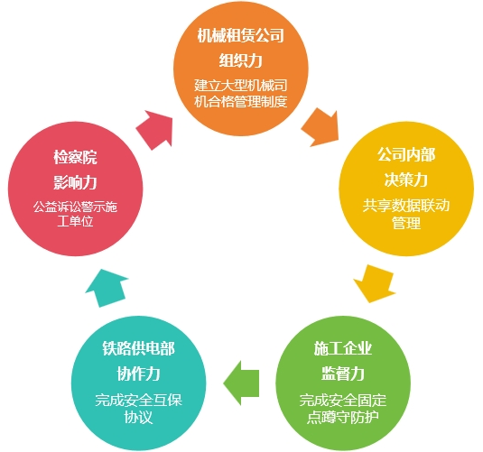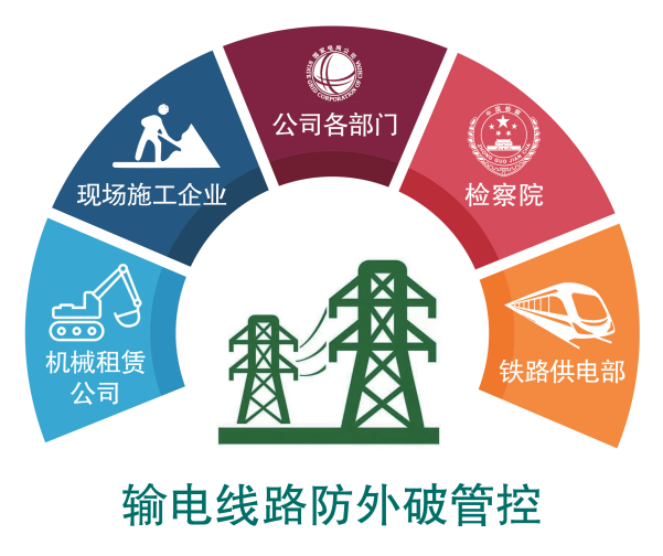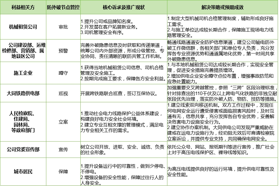 針對利益相關(guān)方的“五力”優(yōu)勢(組織力、決策力、監(jiān)督力、協(xié)作力、影響力),明確核心訴求和責(zé)任邊界,建立大型機(jī)械司機(jī)合格管理、臨時(shí)施工備案信息共享、施工固定點(diǎn)蹲守防護(hù)、鐵路安全互保協(xié)議、檢察院公益訴訟等多維度輸電線路防外破治理體系。