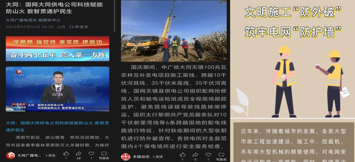 圍繞線下施工高風(fēng)險(xiǎn)、破壞電力設(shè)施責(zé)任追究等方面塑造“五力”防外破責(zé)任品牌,與大同市鑫源企業(yè)文化策劃有限責(zé)任公司簽訂合作意向書,制作漫畫宣傳物料,宣傳報(bào)道在新華社、《亮報(bào)》等主流媒體刊發(fā)。