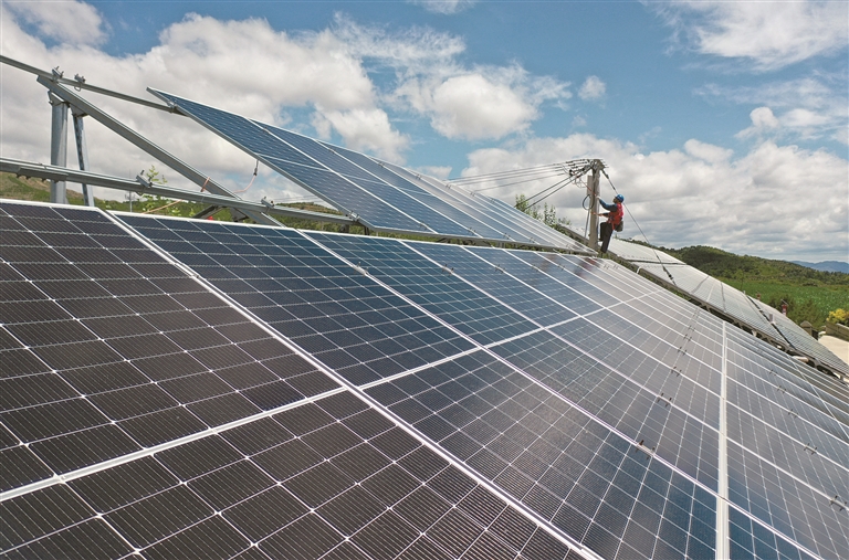 國(guó)網(wǎng)天鎮(zhèn)縣供電公司太行黎明共產(chǎn)黨員服務(wù)隊(duì)隊(duì)員在谷前堡鎮(zhèn)白羊口村對(duì)分布式屋頂光伏進(jìn)行隱患排查。