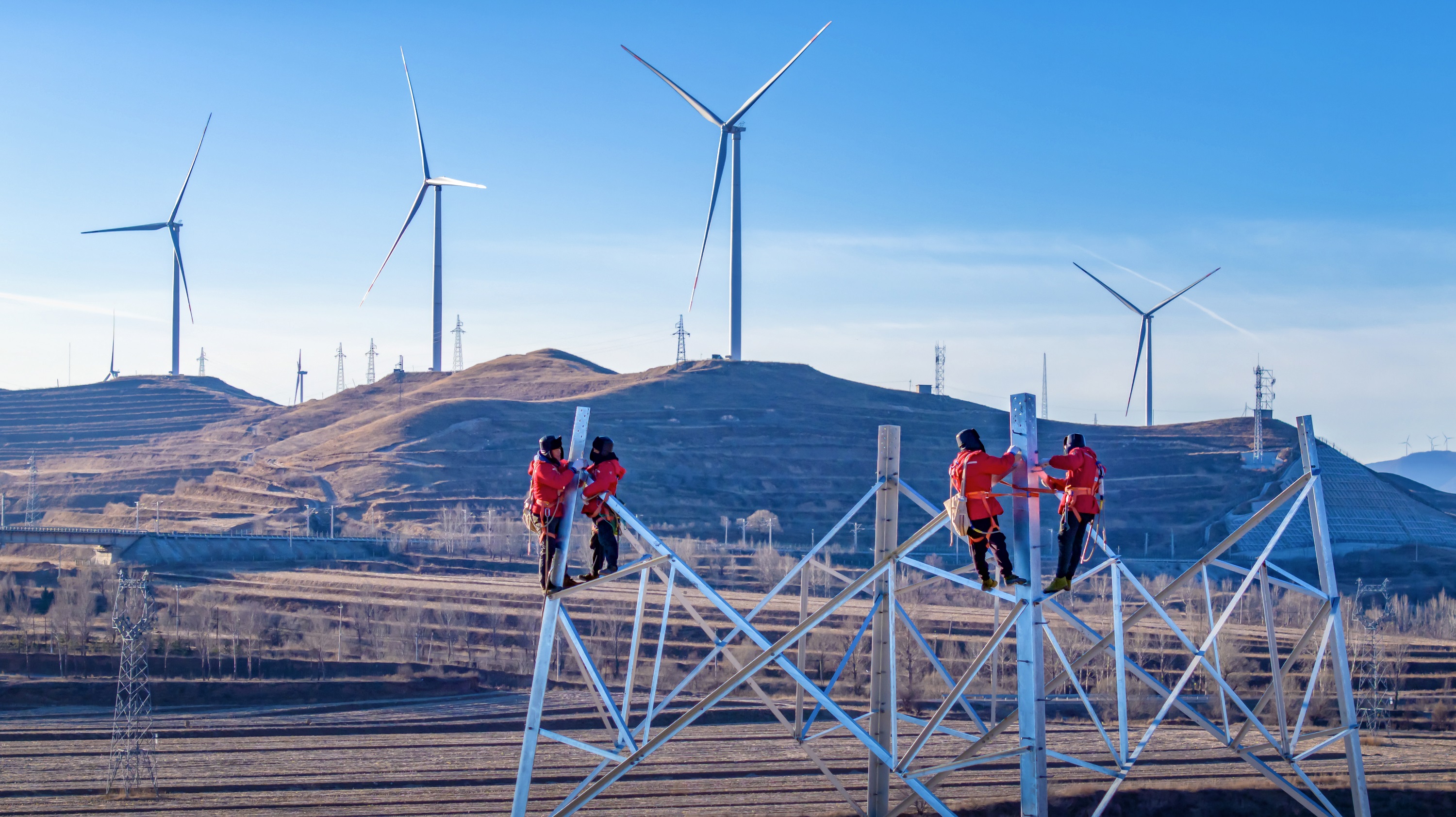 國網(wǎng)山西送變電公司施工人員正在500千伏忻州北-陽泉輸電線路工程現(xiàn)場開展組塔作業(yè),實(shí)現(xiàn)工程建設(shè)和生態(tài)保護(hù)協(xié)同并進(jìn)。